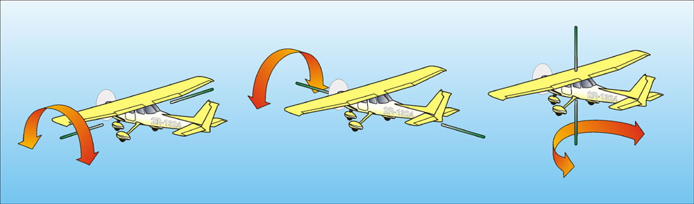 Tri osi na letalu za katere je potrebno upoštevati ravnotežje in stabilnost.