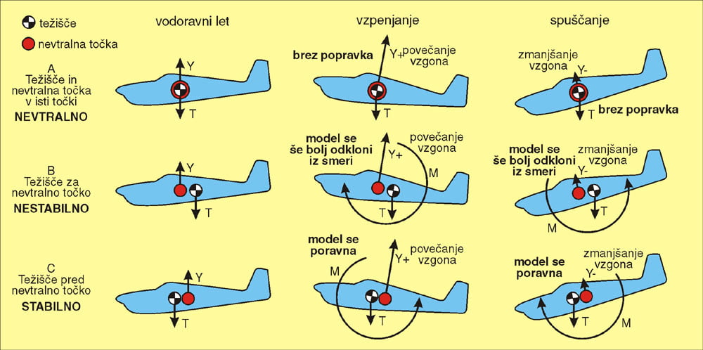 Na risbi C je težišče pred nevtralno točko. Dvig nosa modela povzroči porast vzgona za težiščem. Pojavi se obratni moment, ki nos modela spusti v prvotni položaj. Spust nosa povzroči zmanjšanje vzgona za težiščem, moment pa zopet dvigne nos v prvotni položaj. Takšen položaj se uporablja na različnih modelih, kot prikazuje druga risba.