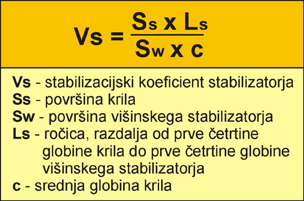 Enačba za določanje velikosti višinskega stabilizatorja vključuje velikost krila in dolžino trupa: