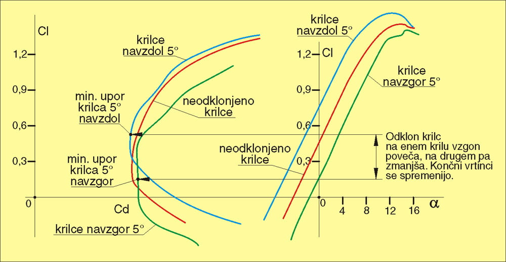 Vpliv krilc. V tem primeru je vzgon neuravnotežen, saj se pojavi velika razlika med induciranim uporom na obeh koncih krila. Z majhnim odklonom krilc se krivulja zelo malo deformira.