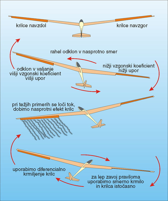 Počasno leteča polovica krila z odklonjenim krilcem navzdol proizvede manj vzgona kot druga polovica krila, ki leti z večjo hitrostjo. Pri nizki hitrosti je zato pri jadralnem modelu bistveno začeti zavoj z uporabo smernega krmila. Dobra rešitev je istočasna uporaba krilc in smernega krmila, ki vsaj delno ublaži odklon iz smeri.