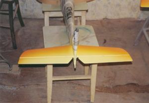 Spodnji del krilaPred barvanjem je bilo treba najprej pripraviti površino. Najmanj problemov je predstavljal trup, ki je narejen iz karbonske tkanine v kalupu. Površino sem samo zmatiral z vodobrusnim papirjem. Krila in stabilizatorji so narejeni iz zvakuumirane balse na stiroporno sredico. Tu je priprava površine vzela kar nekaj časa. Višinski stabilizatorCelotno balso sem temeljito obrusil in prelakiral z nitro lakom. Ko se je lak dobro posušil sem ponovno obrusil vse iveri, ki so se postavile pokonci. Na to površino sem nato z nitro lakom prilepil japonski papir, da sem zaprl pore v balsi. Tako prekrite površine sem nato 3-krat prelakiral z nitro lakom, ki sem mu primešal smukec. Sledilo je brušenje in glajenje površine. Najprej sem uporabil brusni papir zrnatosti 400, da sem hitreje zagladil črte, vidne od čopiča, za konec pa še zrnatost 600. Tako pripravljeno površino sem spihal z zračno pištolo in obrisal z mehko krpo, namočeno v špirit.