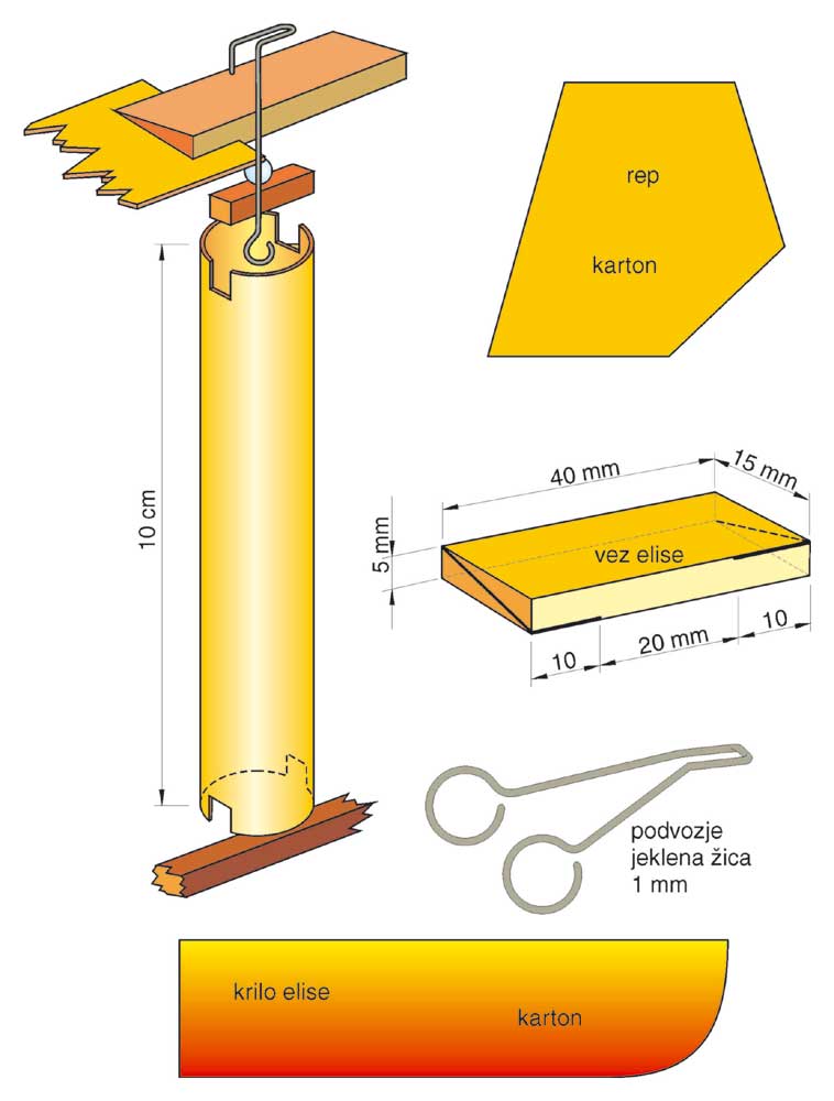 Trup helikopterja je izdelan iz smrekove letvice 5x5x225 mm. Na zadnji strani je prilepljen stabilizator iz kartona in je narisan v naravni velikosti (glej PDF). Cev za gumico naredite tako, da na lesen ročaj od metle navijete nekaj ovojev kartona in ga zlepite. Odrežite ga na dolžino 10 cm in na obeh straneh izrežite utore za letvice. Letvici sta v utore samo položeni, da jih lahko med preizkusnimi leti premikamo. Vez elise izdelajte iz kosa lesa, ki ga zarežete na obeh straneh, kot kaže načrt. V oba utora zalepite krila elise, ki sta prav tako narisana v naravni velikosti. V sredini zvrtajte luknjico, skozi katero potisnete jekleno žico in jo na obeh straneh zakrivite po načrtu. Zgoraj jo zataknete v leseno deščico, da se ne vrti, spodaj pa naredite zanko, v katero zataknete elastiko. Med obema letvicama na jekleno žico nataknite perlo, da bo trenje med vrtenjem čim manjše.
