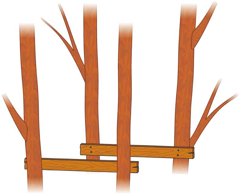 Ko ste našli primerno mesto za gradnjo, najprej z večjimi žeblji pritrdite dve močnejši deski vodoravno. Ti dve deski naj bosta debeli najmanj 3 cm in široki najmanj 15 cm, kajti one bosta držale celo hišico in tudi vse kar bo v njej. Uporabite žeblje dolžine najmanj 12 cm. Da bo pritrditev varnejša, žeblje zabijajte pod rahlim kotom navzdol. Ti žeblji se ne smejo ukriviti, pač pa morajo biti zabiti do konca, da se na deski vidi le glava žeblja. Pazite, da sta obe deski pritrjeni na isti višini.