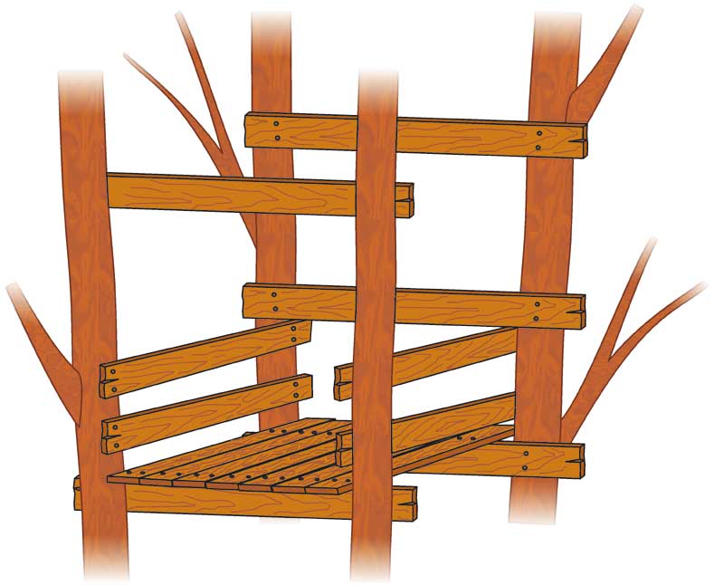 Na to osnovo sedaj že lahko pritrdite lestev. Najbolje jo je močno privezati. Če ste vse naredili pravilno, se lahko že povzpnete na narejen oder. Pri tem bodite previdni, saj še ni postavljene ograje.