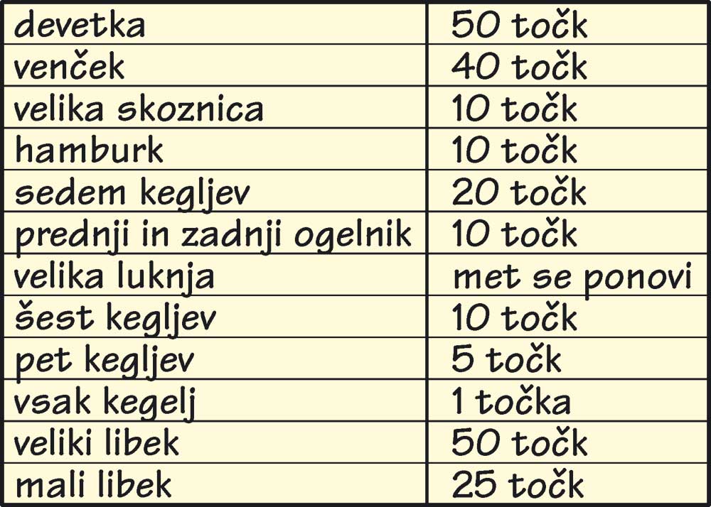 V igri je le pet kegljev: prednji ogelnik, leva in desna prednja dama ter oba kmeta. Igra ima šest krogov, v vsakem pa ima igralec dva meta. Po vsakem metu keglje na novo postavimo in dosežene točke seštejemo. Točkujemo takole: prednji ogelnik – 5 točk, velika luknja – 4 točke, dama – 3 točke, mala luknja – 2 točki in kmet – 1 točka. Pri tem upoštevamo le tisti kegelj, ki daje največ točk.