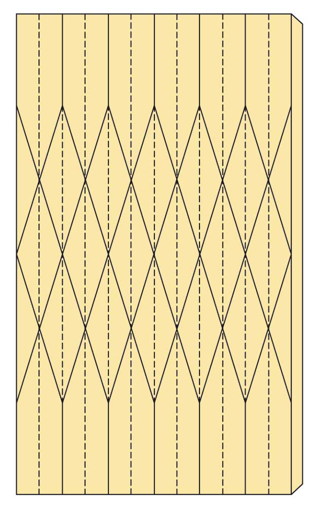 Največjo natančnost zahteva pregibanje papirja, pri katerem nastane zaporedje geometričnih likov. Vsako najmanjše popačenje linij poruši celotno estetsko ravnotežje. Razumljivo je, da sami prsti temu niso kos, zato uporabite močnejši šeleshamer papir in vse linije zgiba rahlo zarežite z olfa nožem na izbočeni strani. Na risbi so debelo narisane črte izbočene navzven zato jih na tej strani zarežete z nožem. Nasprotno od teh pa so črtkane črte vbočene, zato jih morate zarezati na hrbtni strani. Najbolj natančno to opravite, če sečišča prebodete s šivanko.
