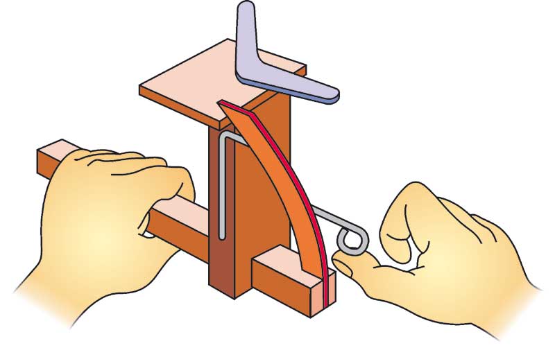 Bumerang izrežite iz tršega kartona, obliko pa lahko prerišete iz načrta v naravni velikosti. Črtkana črta označuje pregib, kjer bumerang narahlo zapognete navzgor. Zapognjena oblika nadomešča aerodinamično obliko pravega bumeranga in mu med vrtenjem v letu ustvarja vzgon. Različni dolžini krakov pa med letom premakneta središče vrtenja in s tem omogočita zavijanje, da se bumerang lahko vrne na isto mesto, od koder ste ga izstrelili.