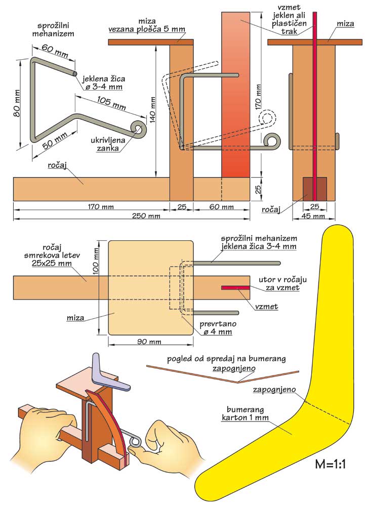 Lansirna priprava je dokaj preprosta. Za izdelavo potrebujete le nekaj kosov smrekovih deščic, jeklen ali plastičen trak in nekaj jeklene žice. Za ročaj si pripravite smrekovo letev 25x25x250 mm. Stojalo mizice naredite iz smrekove deščice 45x25x165 mm in na enem koncu izrežite utor 25×25 mm, kamor boste vstavili ročaj in ga pritrdili z lepilom in žebljem. Na vrhu stojala prav tako pritrdite mizico, ki jo naredite iz vezane plošče ali debelejšega kartona. Mere mizice so 100×90 mm, robove pa polkrožno obrusite (glej PDF).