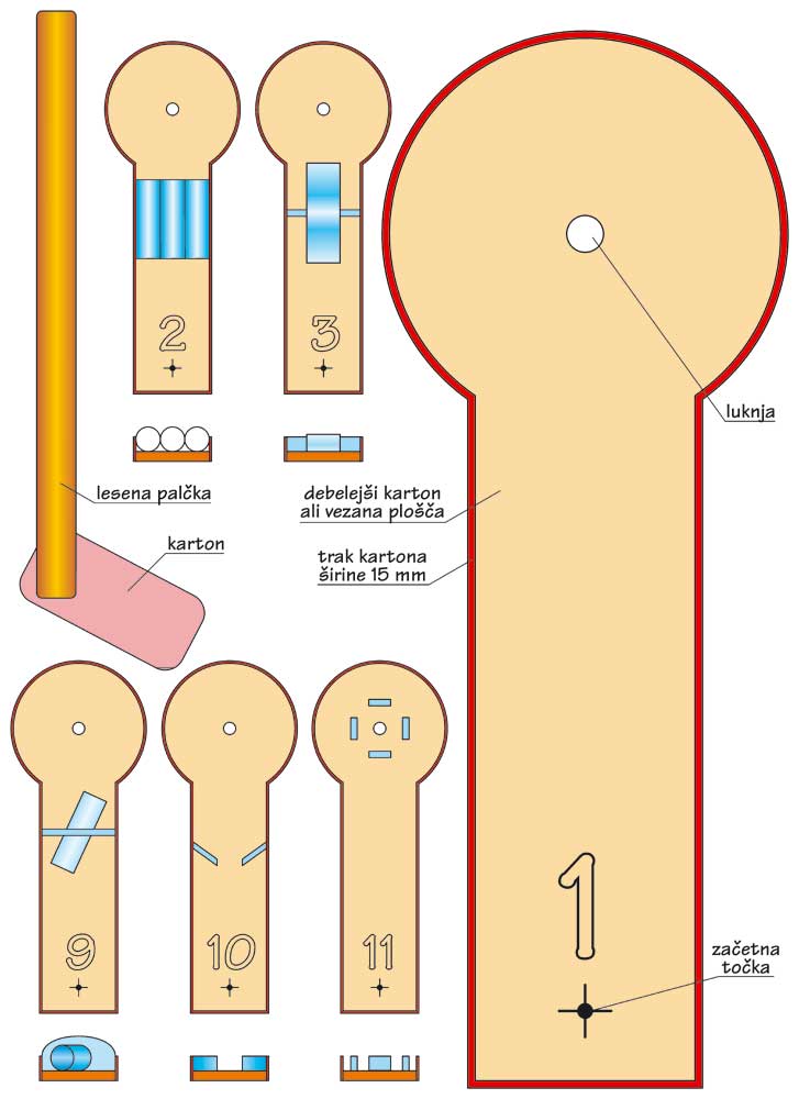 V širšem delu izrežite luknjico, ki je za 3 do 4 mm večja od uporabljene žogice. Iz kartonskega traku, širokega 15 mm, zlepite okoli vsakega podnožja ograjico, da žogica ne bo uhajala ven. Vsaka postaja ima drugače postavljene ovire, ki predstavljajo različne težavnostne stopnje. Za izdelavo teh ovir uporabite kose kartona in lesenih deščic, ki jih prilepite na podlago. Lahko si omislite tudi drugačne ovire in tako še povečate raznolikost igre.