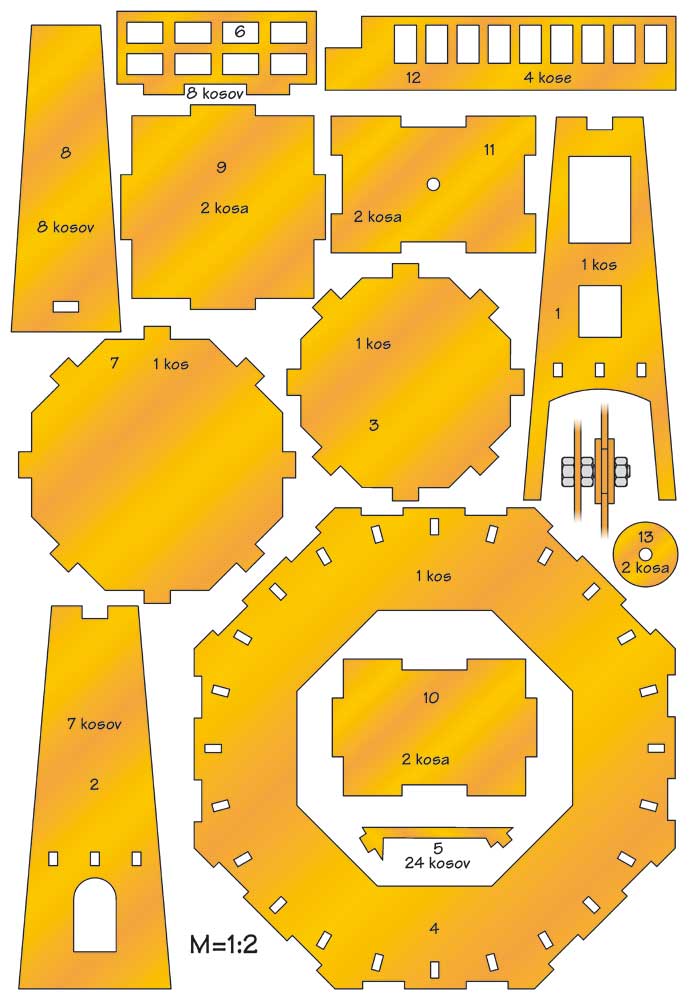 Vsi deli mlina so enkrat pomanjšani, zato je najbolje, da jih fotokopirate na pravo velikost (glej PDF). S pomočjo kopirnega papirja dele prerišite na karton ali vezano ploščo in jih izrežite. Za rezanje vezane plošče boste potrebovali žagico rezljaco, za karton pa le olfa nož. Pri prerisovanju pazite na količino posameznih delov.