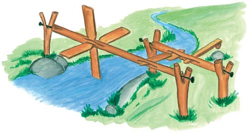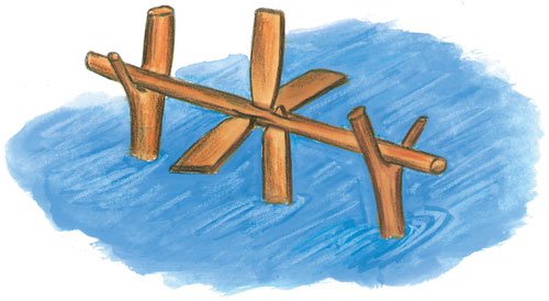 Iz močnejše veje ureži še dve rogovili in ju na spodnjem delu ošili. Zapiči ju vzporeno na vsako stran potoka in nanju položi os z lopaticami. Bodi pazljiv, da bodo vse lopatice segale v vodo. Mlinček se bo veselo zavrtel.