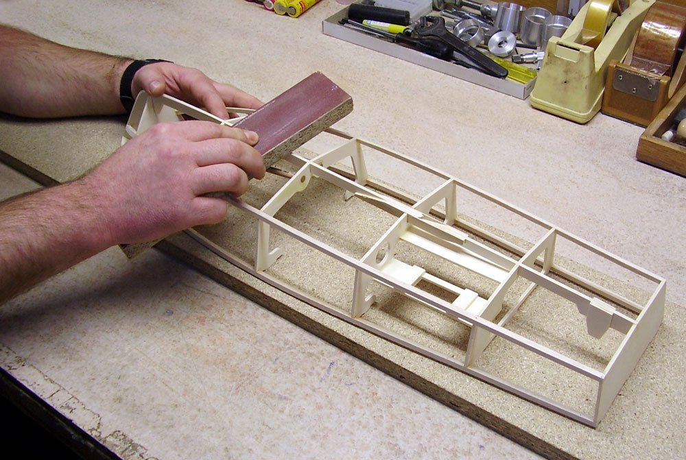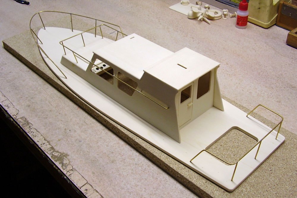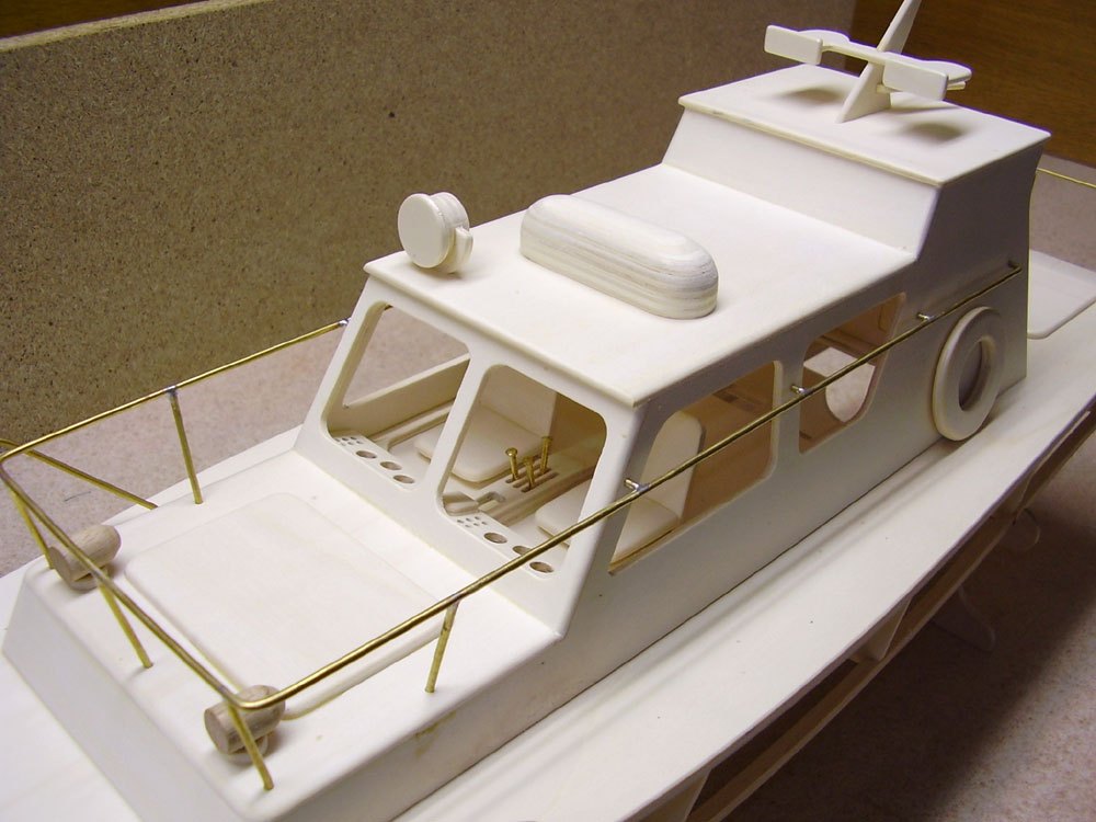 Detajli na čolnu so sestavljeni posamezno, vendar jih še ne prilepite na kabino. Šele, ko boste celotni model prelakirali in zgladili, boste lahko te dele prilepili na svoje mesto. Veliko lažje je brusiti ravne površine, kot pa se ukvarjati z robovi okoli detajlov.