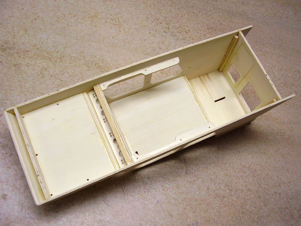 Okoli odprtine na osnovni plošči R8 nalepite kvadratne letvice P36, dimenzije 5×5 mm. Te letvice preprečujejo, da v notranjost trupa ne pride voda, obenem pa na svojem mestu drži celotno kabino. Prilepite najprej krajši letvici, daljši pa samo postavite zraven in preverite, da se kabina lahko natakne na ta okvir. Kabina se mora natakniti dovolj tesno, da se sama ne sname, če model obrnemo na glavo. Obenem pa ne sme sedeti na tesno, saj moramo upoštevati še debelino laka in barve.