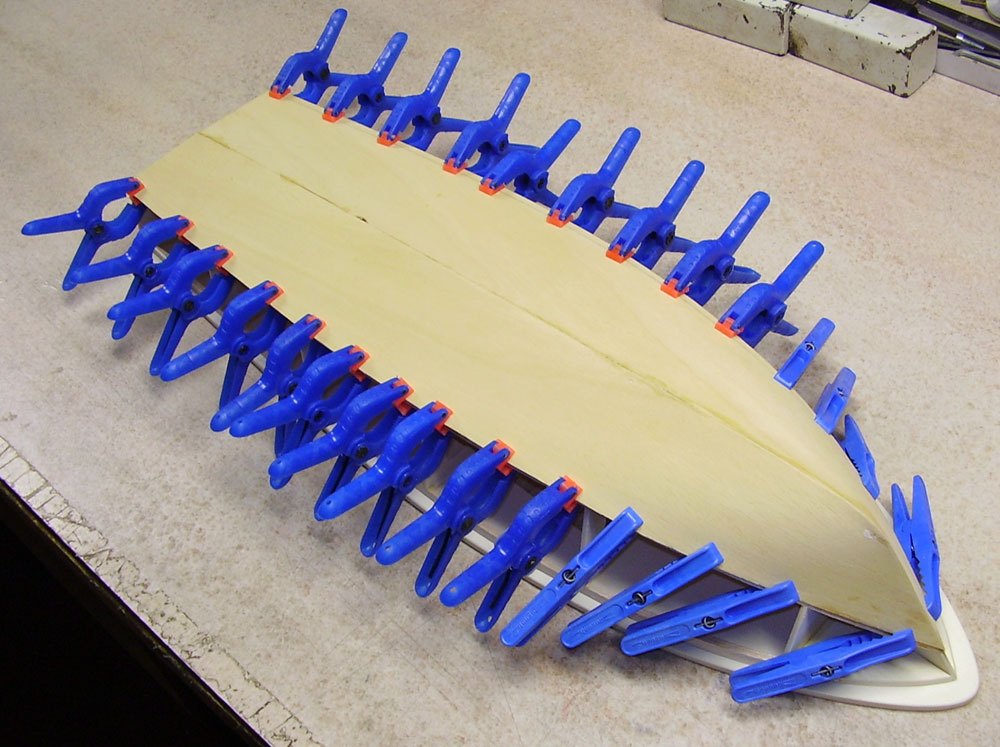 Ukrivite najprej obe letvici, ki se nahajata na osnovni plošči in ju utrdite z bucikami. Spoje zlepite in bodite pozorni, da letvice dobro sedijo v vseh utorih na rebrih. Sedaj lahko ukrivite še drugi dve letvici in ju prav tako utrdite z bucikami ali ščipalkami za perilo. Ko se lepilo dobro posuši, z deščico, na katero ste prilepili brusni papir, pod kotom, ki ga določajo rebra, obrusite letvice. Delo bo lažje, če boste celotno konstrukcijo trupa odstranili od osnovne plošče.