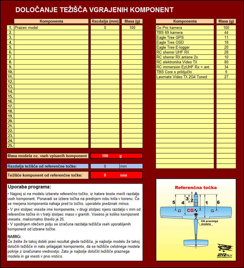 Pri gradnji modela, oziroma pri vgradnji elektronskih komponent in pogona, se pogosto srečamo s težavo kam komponente vgraditi, da se nam razporeditev pokrije s težiščem. Postavljanje težišča na pravo mesto z dodajanjem uteži spredaj ali na rep nam doda le dodatno maso modela, kar pa ni zaželeno. V pomoč nam je lahko preprost program, s katerim lahko že v naprej določimo mesta vgradnje za vsak element in tako dosežemo pravo lego težišča.