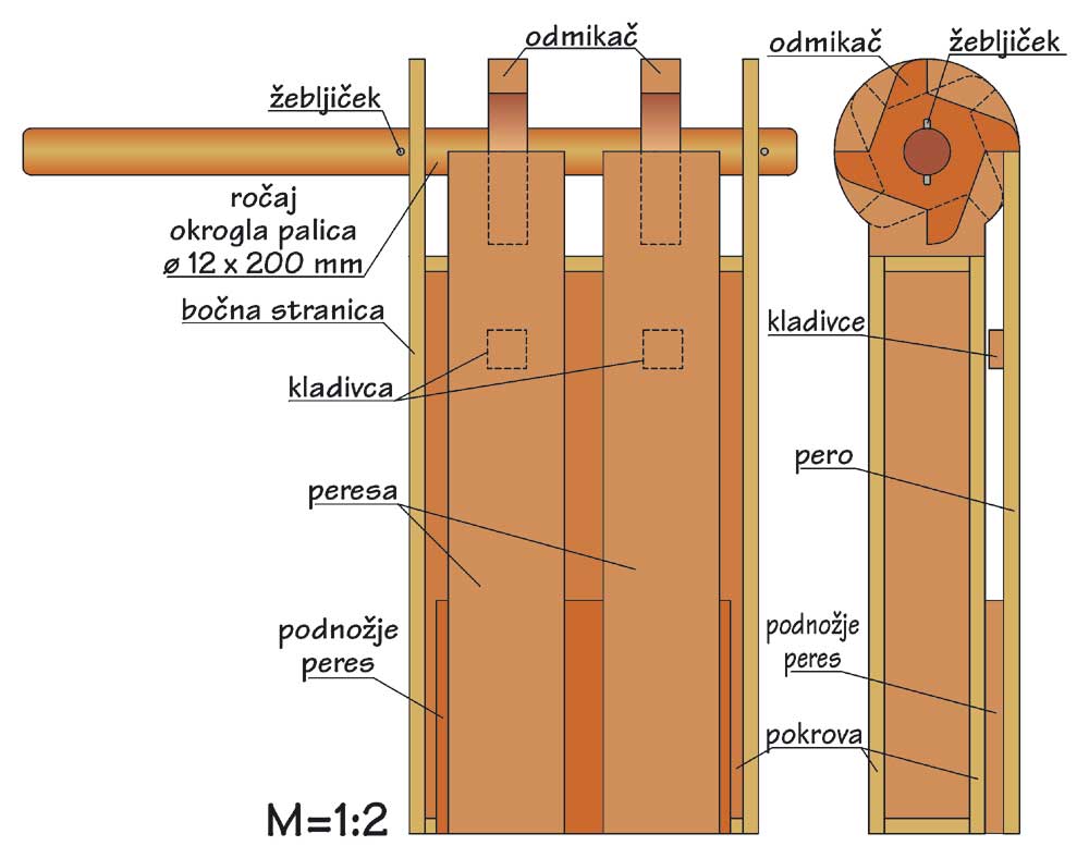 Spodnji pokrov resonančne škatle ima luknje, zgornji pa ne. Skozi te luknje prihaja zelo ojačan zvok. Najprej med seboj zlepite spodnji pokrov in vse stranice, nato pa še zgornji pokrov, na katerega prilepite še podnožje peres, peresa in kladivca. Ko se lepilo dobro posuši vse robove lepo polkrožno obrusite in prelakirajte z brezbarvnim nitro lakom. Odmikača izrežite iz 8 do 10 mm debele vezane plošče, če pa takšne nimate na razpolago, lahko izrežete po dva kosa in ju med seboj zlepite. Odmikača nataknite na okroglo paličico, ki služi kot ročaj. Pred tem morate paličico vstaviti v luknjo v stranici. Na obeh zunanjih straneh v paličico zabijte dva žebljička, ki preprečujeta, da se paličica ne sname iz ohišja, obenem pa morata zagotoviti nemoteno vrtenje. Sedaj lahko na paličico prilepite oba odmikača, ki ju med seboj zamaknete pod kotom 45 stopinj. Na ta način bosta oba peresa izmenično tolkla ob ohišje, regljanje pa bo lepše.