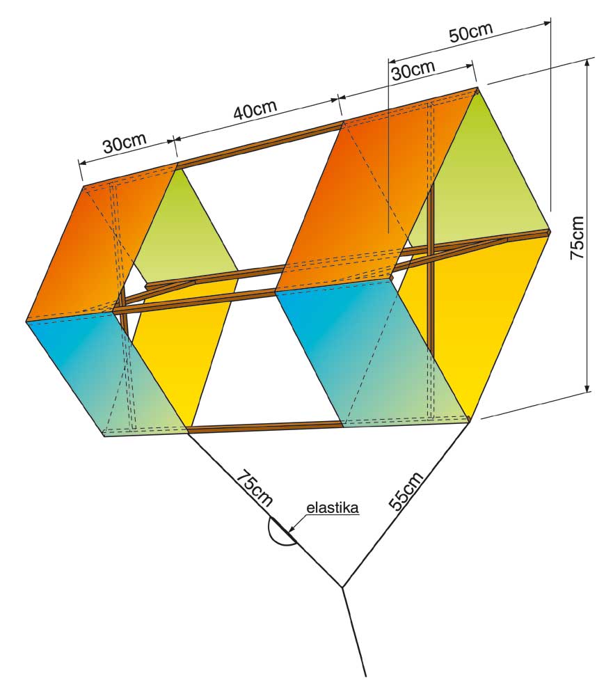 Pred začetkom sestavljanja si pripravite ves potreben material in orodje. Smrekove letvice, ki sestavljajo ogrodje, naj imajo presek od 6×6 mm do 9×9 mm. Potrebujete štiri letvice dolžine 100 cm, dve dolžine 49 cm in dve dolžine 74 cm. Za prekrivanje potrebujete dve poli svilenega papirja ter tanko najlonsko vrvico. Za vzmet uporabimo večjo gumo. Od orodja potrebujemo le pribor za obdelavo papirja (glej PDF).