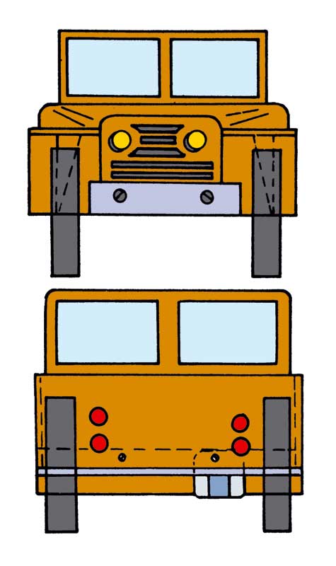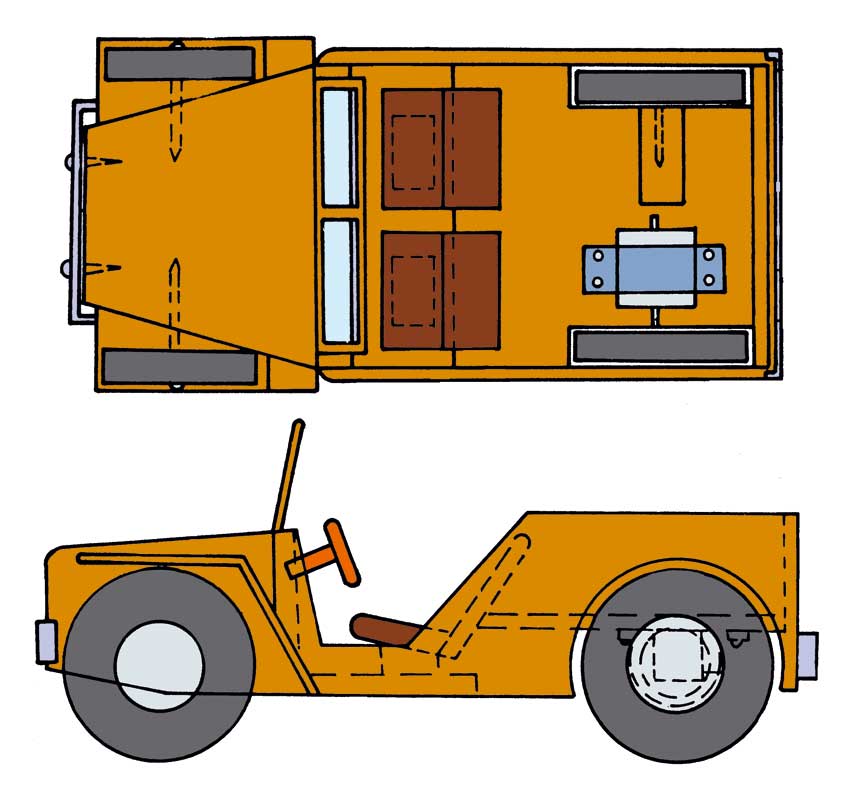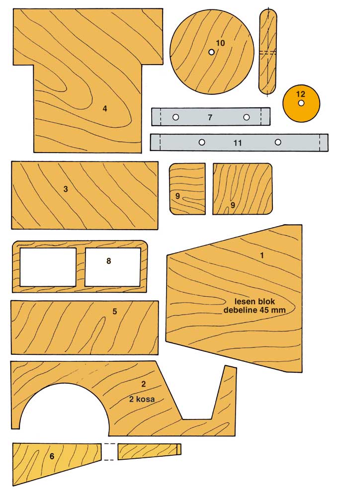 Iz vezane plošče debeline 4 mm z rezbarsko žagico izrežite vse dele ter jih obrusite z brusnim papirjem. Kolesa naredite iz 8 mm debele vezane plošče in jih polkrožno obrusite. Prednji del avtomobila naredite iz bloka smrekove deske in ga obdelajte, kot kaže načrt.
