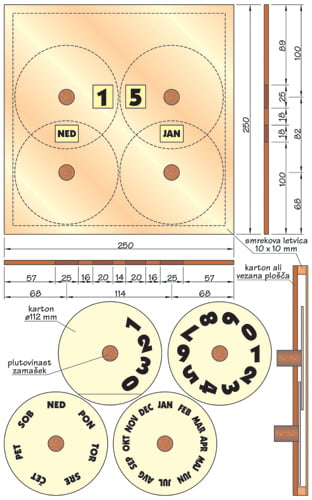 Naš koledar ne kaže letnice, ker si jo pač lahko zapomnimo; če pa kdo želi, si lahko izreže še okence za letnico. Krog mora biti premera 220 mm, gumb za vrtenje pa se nahaja točno na sredini plošče. Odprtino za letnico naredite na sredini nad številkama dneva v mesecu.