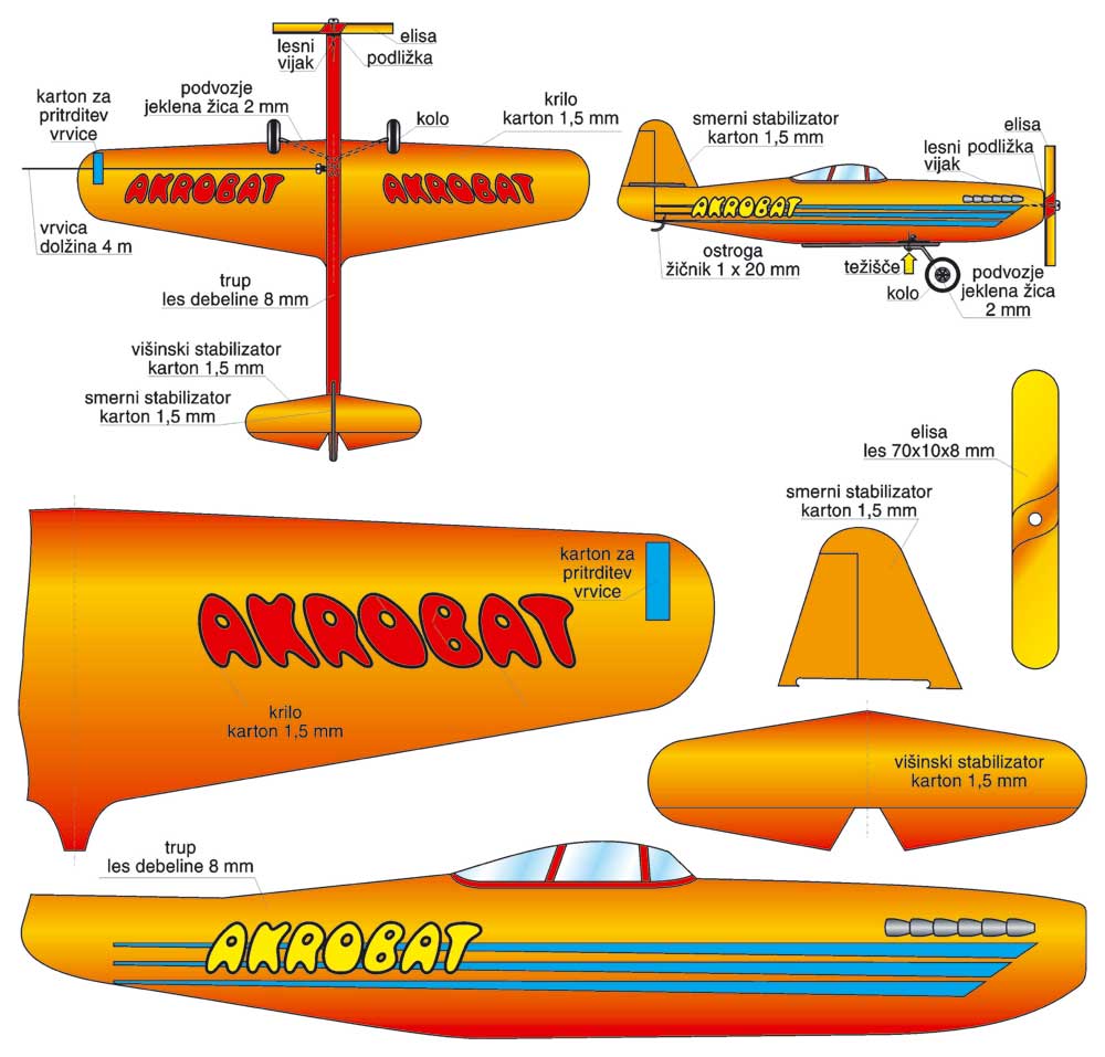 Pred vami je načrt za zabaven model, s katerim boste lahko izvajali tudi akrobacije. Za izdelavo potrebujete le kos vezane plošče ali lesa debeline 8 mm, debelejši karton, vrvico dolžine okoli 4 metre in nekaj vijakov.