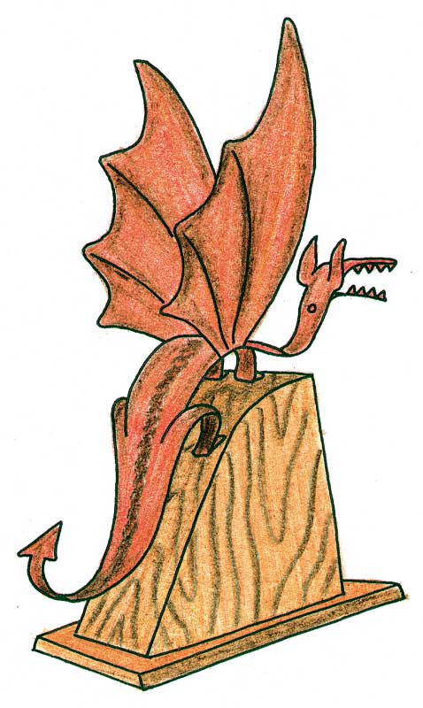 Za zmaja si iz lesene deščice naredite tudi primeren podstavek, ki ga prav tako prelakirate z brezbarvnim nitro lakom. Na nogah zmaja naredite majhne luknjice skozi katere vstavite majhen žebljiček in ga pribijete v podlago.