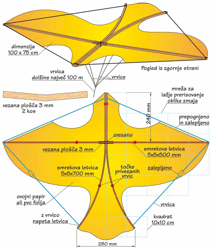 Skozi papir, na mestih, ki so na načrtu označena z rdečo piko, naredite luknjice in skoznje povlecite tanko vrvico in jo privežite. Vseh pet vrvic zvežite skupaj tako, da bo zmaj, če ga pustite prosto viseti na teh vrvicah, visel s prednjim delom nekoliko nižje kot zadnji. Razlike naj bo okoli 10 do 12 cm. Na ta skupek vrvic pa privežite še 100 metrov dolgo vrvico za spuščanje. Najbolje je uporabiti tanko najlonsko vrvico, kakršno uporabljajo ribiči.